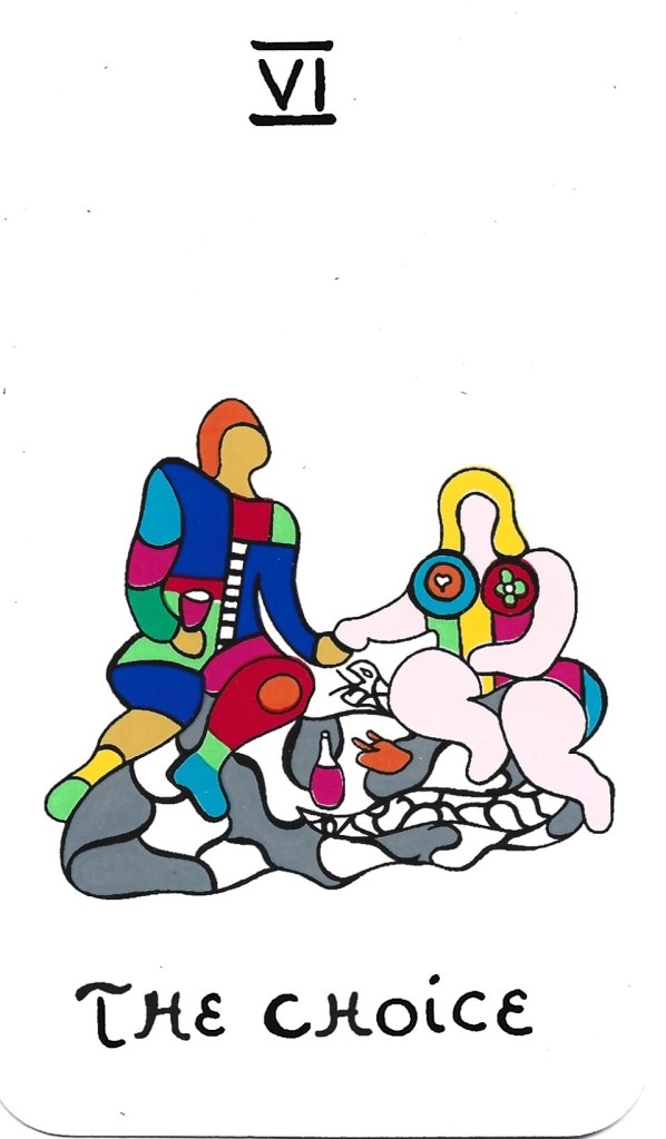 The artist Niki de Saint Phalle, creator of The Tarot Garden in Italy, paid homage to both the Tarot de Marseille and the Waite Smith deck when she named her card The Choice. Adam and Eve enjoy a picnic in the Garden of Eden, using the snake’s coils as a blanket. The artist felt Adam and Eve were most appropriate for this card because they were first people in history to make an important, life-changing choice.