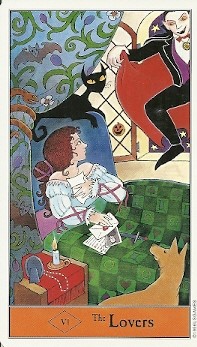 A. E. Waite went in an entirely different direction when he designed his Lovers card. Although he was an enthusiastic member of the Golden Dawn, after its collapse he drifted into Christian mysticism. The Waite Smith deck has numerous Christian elements mixed in with astrology, Kabbala and a touch of Egyptomania, thanks to Eliphas Levi. But this card, depicting Adam and Eve in the Garden of Eden, is probably the most thoroughly Christian of all his major arcana cards. Adam stands in front of the Tree of Life with twelve fruits that look like flames. Behind Eve is the Tree of Knowledge with apples and a snake. Waite does not identify the angel, rather he describes it as “a great winged figure pouring down influences”. Later Golden Dawn initiates, like Paul Foster Case, identified the angel as Raphael pouring blessings equally on both sides of the male-female polarity. Psychologically inclined authors see the three figures as the trinity of conscious, unconscious and superconscious mind.