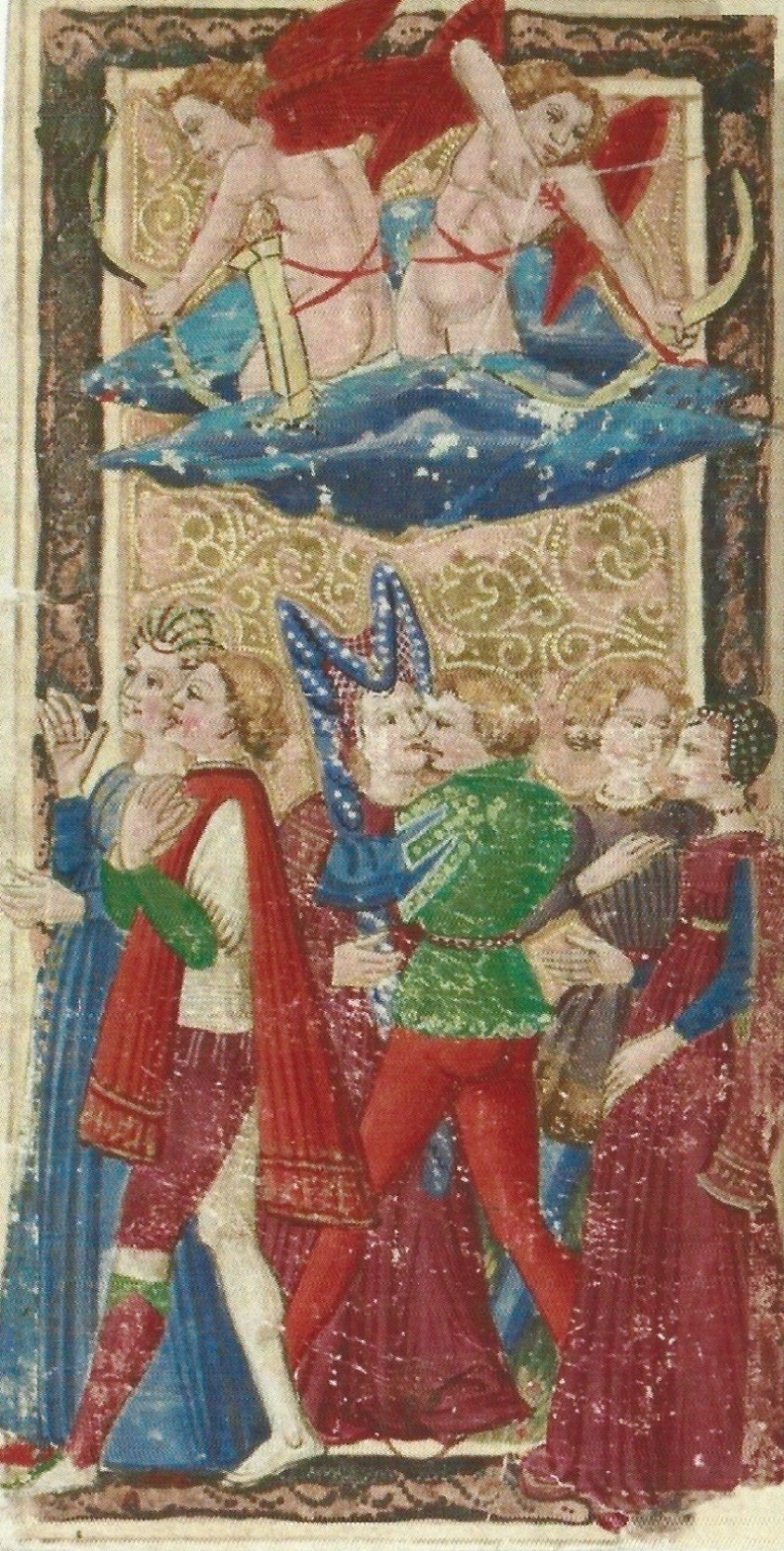 Here is a hand-painted, Italian Love card that’s not about marriage; it’s more like the block printed decks discussed below. The so-called “Charles VI” deck, possibly made in Florence in the 1460s, shows three promenading couples, one of them rather amorous, being goaded by two Cupids. As in the other painted tarot cards, Cupid is a classical youth, not the chubby cherub of the late Renaissance.