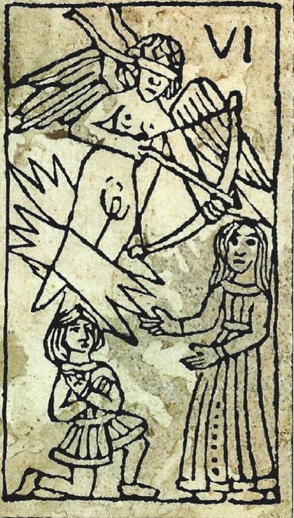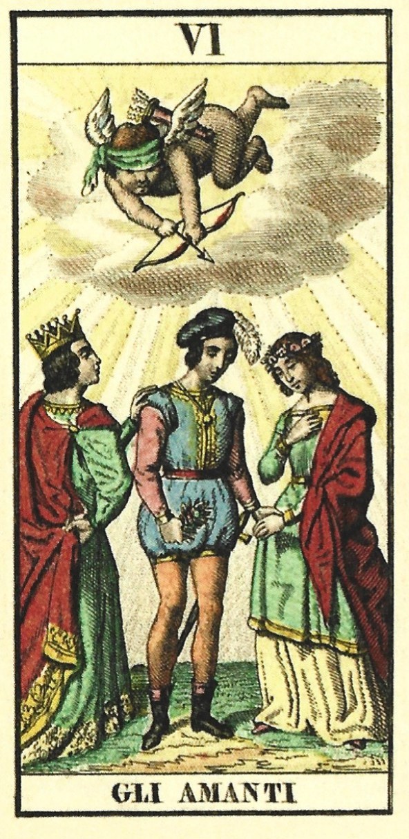 In the Dotti card, as in most Italian-style decks, Cupid takes aim at the woman. Notice that the Italian title is plural. When the Tarot de Marseille entered Italy and Italian printers started making their own versions, they translated the French title as Gli Amanti/The Lovers. This may be the origin of the English title.