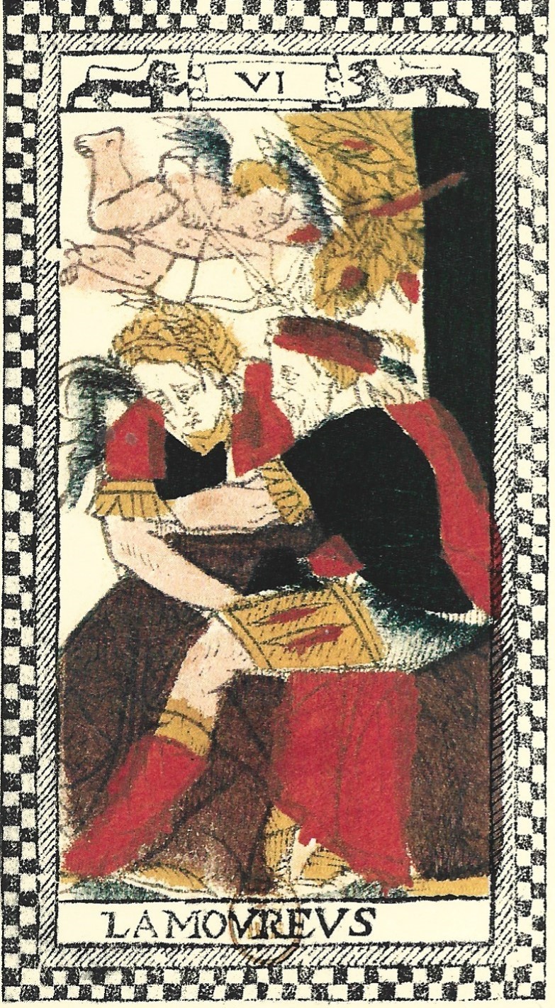 The card title, LAMOVREVS, is a misspelling of the standard TdM title: Lamoureux/L’amoureux (The Male Lover). In spite of how it looks, the title is not plural. The Lover, singular, refers to the man in the center of the TdM card. In the Tarot de Paris, and the later Tarot de Marseille style, the man is Cupid’s target. Coupled with the card title, this makes the male lover the most important figure in the card.