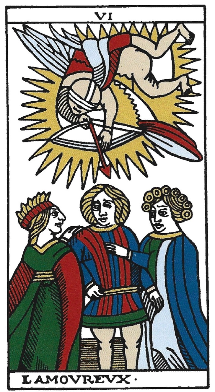 The Tarot de Marseille that emerged in the seventeenth century is radically different from the Italian Love card. The courting couple is replaced by a young man standing between two women who pull him in opposite directions. One woman is young and lovely with flowers in her hair; the other is older, homely and wears a laurel wreath.