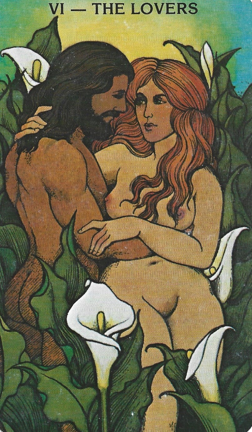 A. E. Waite went in an entirely different direction when he designed his Lovers card. Although he was an enthusiastic member of the Golden Dawn, after its collapse he drifted into Christian mysticism. The Waite Smith deck has numerous Christian elements mixed in with astrology, Kabbala and a touch of Egyptomania, thanks to Eliphas Levi. But this card, depicting Adam and Eve in the Garden of Eden, is probably the most thoroughly Christian of all his major arcana cards. Adam stands in front of the Tree of Life with twelve fruits that look like flames. Behind Eve is the Tree of Knowledge with apples and a snake. Waite does not identify the angel, rather he describes it as “a great winged figure pouring down influences”. Later Golden Dawn initiates, like Paul Foster Case, identified the angel as Raphael pouring blessings equally on both sides of the male-female polarity. Psychologically inclined authors see the three figures as the trinity of conscious, unconscious and superconscious mind.
