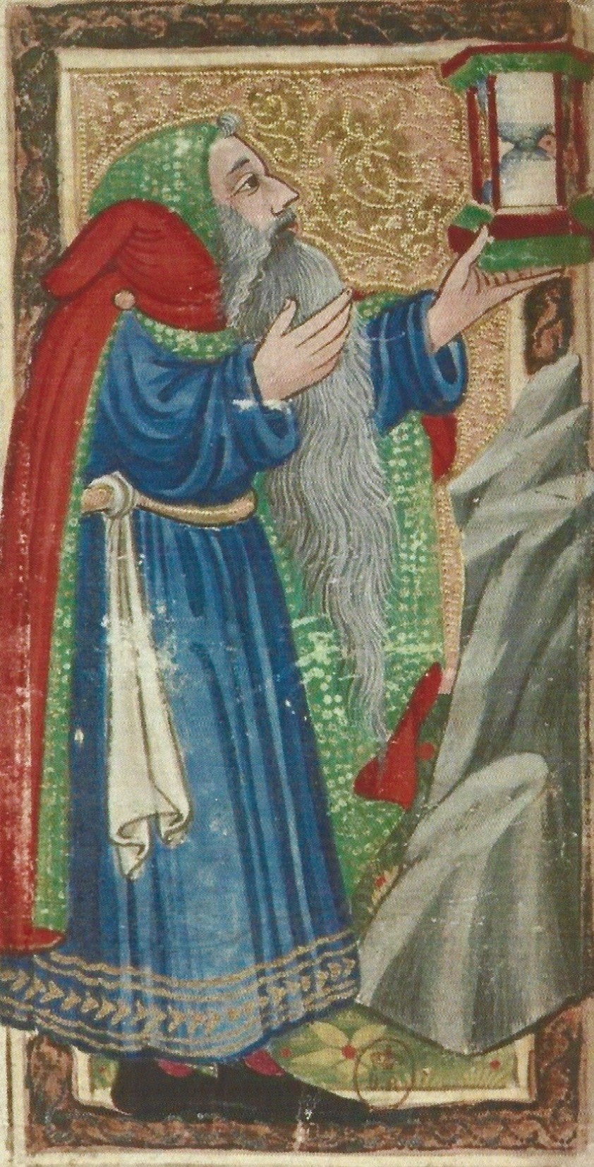 One of the earliest known cards of this type (shown at left) is from a Trionfi deck hand painted for an Italian aristocrat in the middle of the fifteenth century. A well-dressed old man, with a very long gray beard, and wearing a rich blue robe embroidered in gold, stands in front of a rock formation holding up a large hourglass. He is acutely aware that the sands of time are running out for him and embodies three ways Time was pictured in the Renaissance: Petrarch’s allegory of the passage of time; the last age of human life; and the influence of astrological Saturn. Let’s look at how these factors influenced the card’s design.