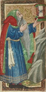 Transitional cards, between the fifteenth-century Italian Old Man Time and the seventeenth-century Tarot de Marseille Hermit, have a striking resemblance to depictions of hermits in art. To give one example, there’s Albrecht Durer’s engraving of the giant Reprobus carrying a small boy across a dangerous river. In the background we see a tiny hermit who was Reprobus’ teacher in the Christian faith. As the small boy turned out to be the Christ Child himself, Reprobus was transformed into Saint Christopher, the Christ-Bearer, and the patron saint of travelers.