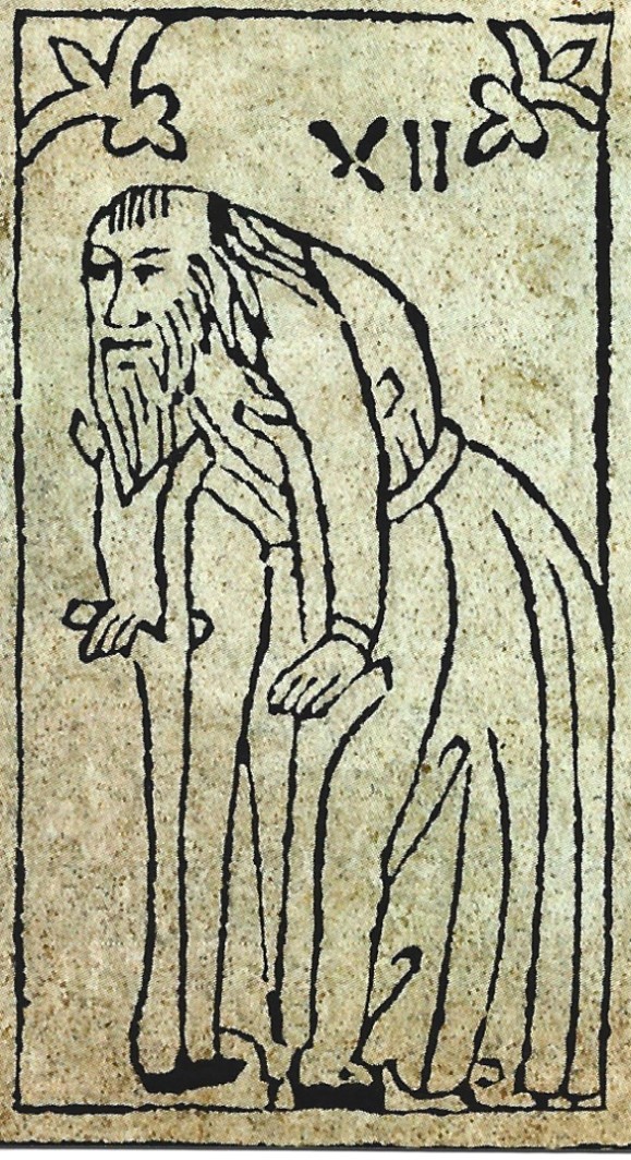 The Hermit card began as something quite different in fifteenth-century Italy. He was never called the Hermit; and he never carried a lantern. We know from numerous Italian essays, poems and lists of trump cards that the card we call “the Hermit” was named Il Tempo/Time, Il Gobbo/The Hunchback, or Il Vecchio/The Old Man. He carried an hourglass and was the embodiment of Old Man Time (Father Time).