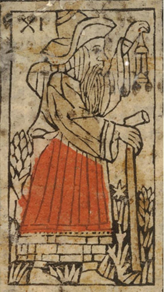 The Rouen-Bruxelles tarot pattern, a variant of the Tarot de Marseille printed in the 17th and 18th centuries, has several trump cards, including the Hermit, that look back to earlier examples. The Vandenborre Hermit’s knotted rope belt echoes the Catelin Geofroy hermit. He’s holding a rather ambiguous object that doesn’t resemble either a lantern or an hourglass. The way he’s holding it can suggest a book.
