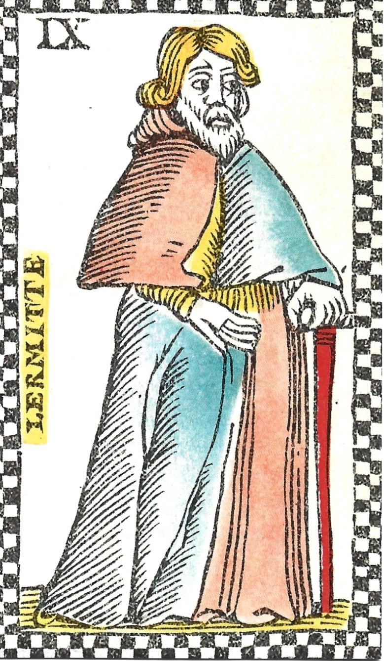 Although a few early French cards depict a monk, the card was never given that name. The first decks with titles on the cards, the Tarot de Paris and the Jean Noblet, both printed in Paris in the seventeenth century, are titled LERMITE, The Hermit. That name has been with the card ever since.