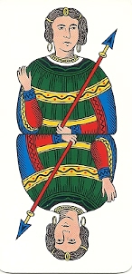 Modern Moors are nearly identical; the only difference being the number of arrows or spears they hold. But some of the earliest decks give the Moors more personality. The Al Mondo deck from the mid-1700s shows the Moors holding symbolic implements that hint at their origins as secular or religious figures. The Moor shown here, an Emperor substitute, holds a scepter topped by the sun, indicating he’s a masculine and secular figure.