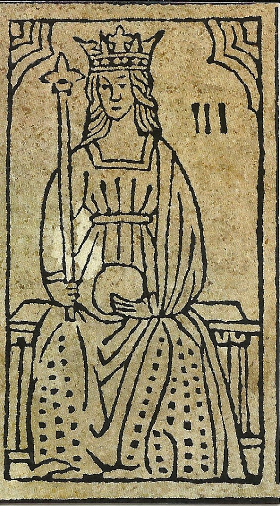 Royal women of the Middle Ages and Renaissance often presided over their own courts, and were a locus of power in their own right, based on personal connections and their family’s hereditary lands. Once a queen fulfilled her most important duty by producing an heir, she was often given her own castle and granted a good deal of personal freedom. Traditionally, the Allegory of Empire or Power was rendered as a woman on a throne with imperial insignia, like the Renaissance engraving shown here. Early Tarot Empresses are independent, powerful and depicted as most people imagined her: remote, surrounded by symbols of her rank, eternally beautiful and untouchable.