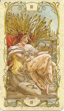 Another Waite-based card, done in the style of Alphonse Mucha, emphasizes her Venus/Aphrodite aspect. This Empress is beautiful, seductive and luxuriates in abundance, signified by the wheat fanned out behind her like a peacock’s tail.
