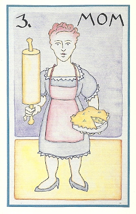 Brian Williams’ witty PoMo deck gives us a rather overbearing Mom, offering a pie with one hand while wielding a menacing, over-sized rolling pin with the other.