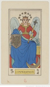 The empress who presides over the court’s social activities is behind the Tarot Empress as wife and mother, efficiently managing her household while maintaining an active social life with a network of friends and family. Less flattering card meanings stress the negative aspects of femininity: frivolous, emotional, self-indulgent, vain, and a busy-body. Whatever her status, she must negotiate a patriarchal social system where her rank and power are conferred by her husband and her worth rests on her ability to give birth to male heirs who will continue her husband’s dynasty.