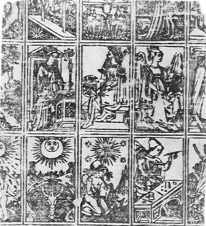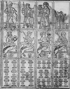 It’s still an open question which came first. Were the luxurious hand painted cards modeled on mass produced tarot decks, or did a printer model his inexpensive block printed tarot deck on the aristocratic hand-painted pattern? Since the physical evidence is so sketchy, we can’t be sure which came first, or how closely the aristocratic hand made decks resembled the cards used for game playing.