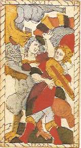 The French Catelin Geoffroy deck of 1557 is the first block printed deck to survive. This high-quality deck has figures that are more animated and rounded than the usual stiff TdM woodcuts. The Trumps have standard numbering, and the imagery is similar to a standard Tarot de Marseilles deck, with some unique exceptions. The Tower shows two people caught in a storm, one of them playing the violin, while the Devil has a shovel over his shoulder. The pip cards are based on the German Virgil Solis deck of 1544 with suits of Lions, Monkey, Parrots and Peacocks.