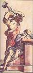 Jacques Vieville, a Parisian card maker and contemporary of Noblet, printed the earliest known example of Belgian, or Flemish-style, Tarot. In this style, Trumps 1 through 11 are the same as the standard Tarot de Marseille, while most higher numbered trumps have images unique to this type of deck. Temperance holds a rod in one hand while pouring water from a jar into another jar on the ground. The Hanged Man is upright and the card titled is misspelled “Lepen du”. The Tower is called Lightning and shows a person under a tree in a hailstorm. The Star depicts an astronomer with calipers, the Moon shows a woman under a tree holding a spindle, and the Sun is a youth on a horse. Several figures face the opposite direction because the card maker failed to carve the wood block in mirror image, causing the printed card to come out reversed.